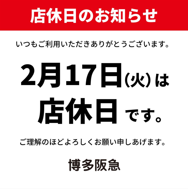 博多阪急店 休館日のお知らせ 2026.02.12 店舗情報 いつも博多阪急店をご利用いただき、ありがとうございます。 2/17(火)は、博多阪急休館日となっております。 翌日2/18(水)は、通常通り営業いたします。 どうぞよろしくお願いいたします。 お知らせ一覧に戻る