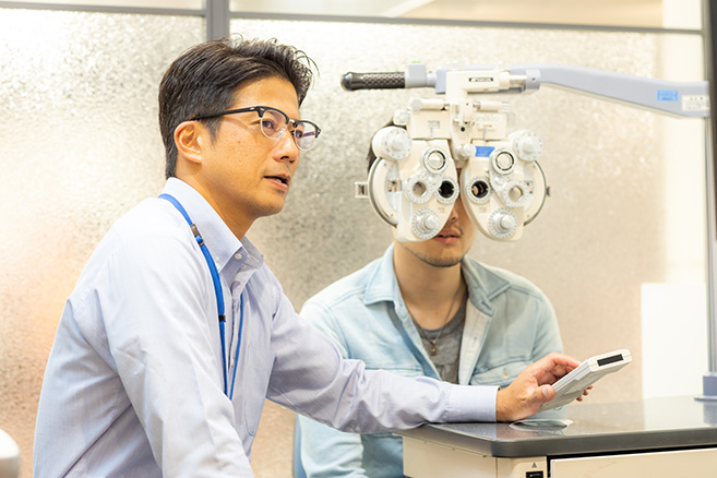 「ブレを無くしていく検査手順は、正確な完全矯正値を導き出す手法なんですよ。カウンセリングによって生活環境にフィットした度数設定を導き出し、快適なレンズが決まります」とお店の方。